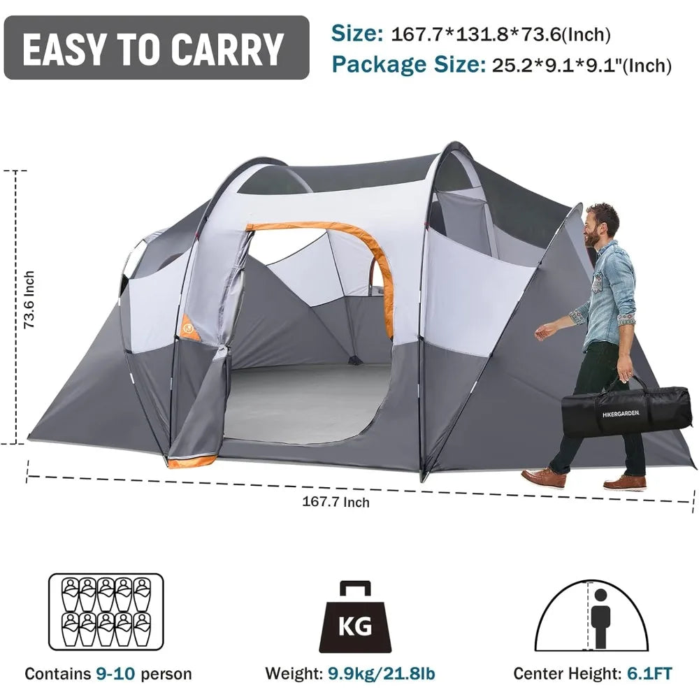 HIKERGARDEN 10 Person Camping Tent - Portable Easy Set Up Family Tent for Camp, Windproof Fabric Dome Tent Outdoor for Hiking, B