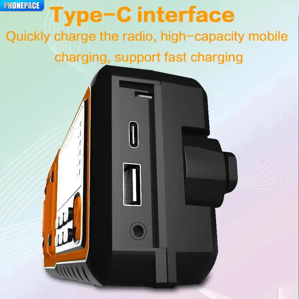 Features: LCD digital display, solar energy, speaker, SOS emergency alert, high sensitivity antenna, headphone jack, USB output 5V 2A, Type-C USB input, 1W flashlight, 2W reading lamp, emergency hand crank