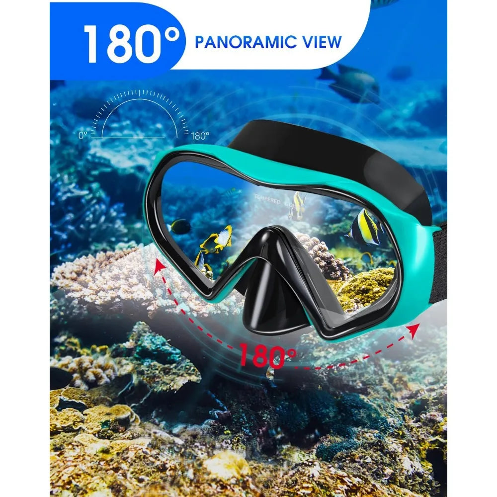 - Premium Tempered Glass Mask -The scuba mask has tempered glass with shatter-resistant lenses that are resistant to deep water pressure. The 180° large view provides a better field of vision and enhances a clearer underwater view to give you a safe swimming experience and allow you to enjoy the fun of the underwater world.